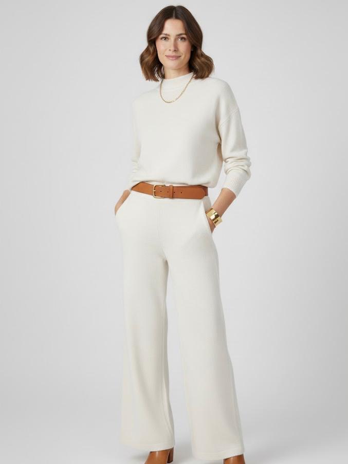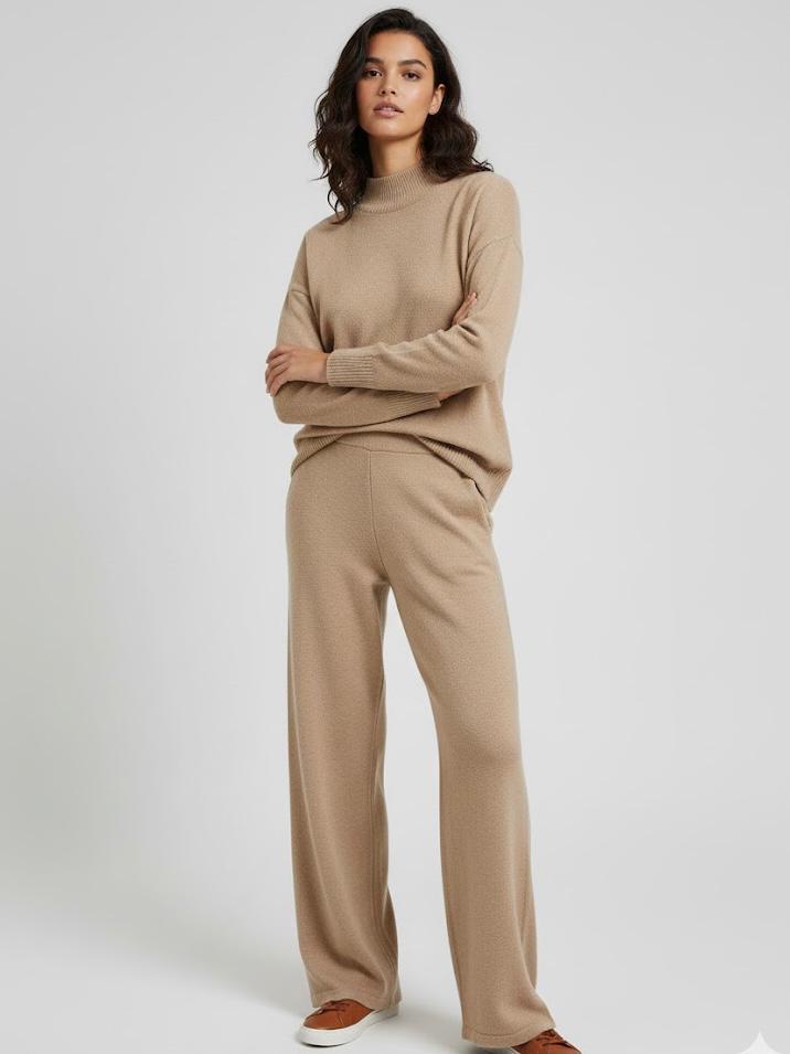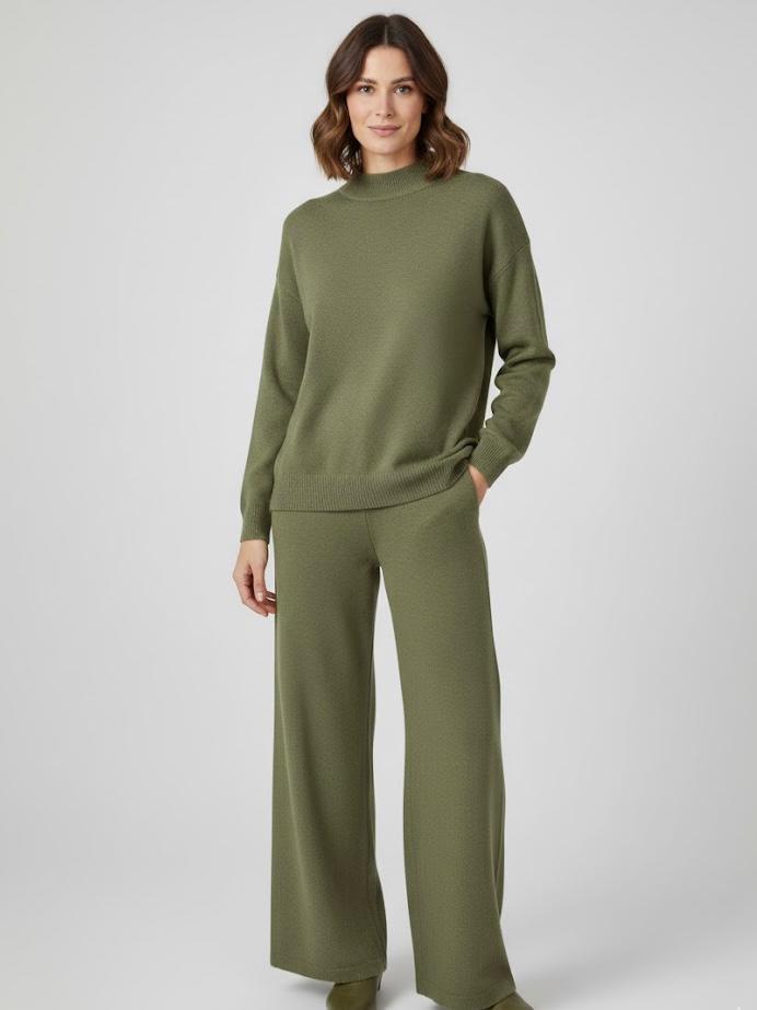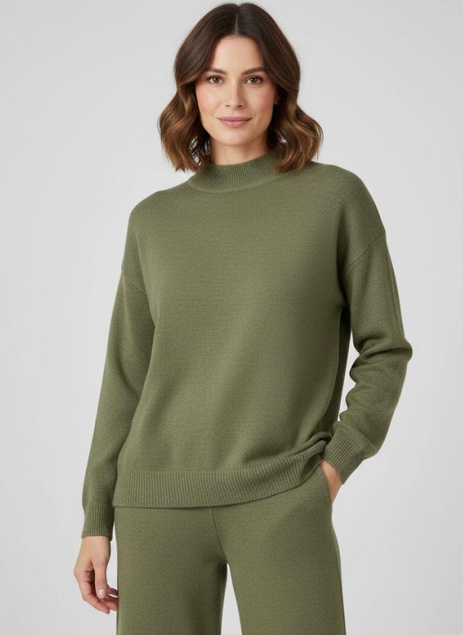 Este conjunto con cuello perkins es ideal para los días más frescos, combinando estilo y confort en una sola prenda. Su diseño sencillo y sofisticado estiliza la silueta, mientras que su tejido suave lo convierte en un básico perfecto para el día a día o para looks más arreglados.
