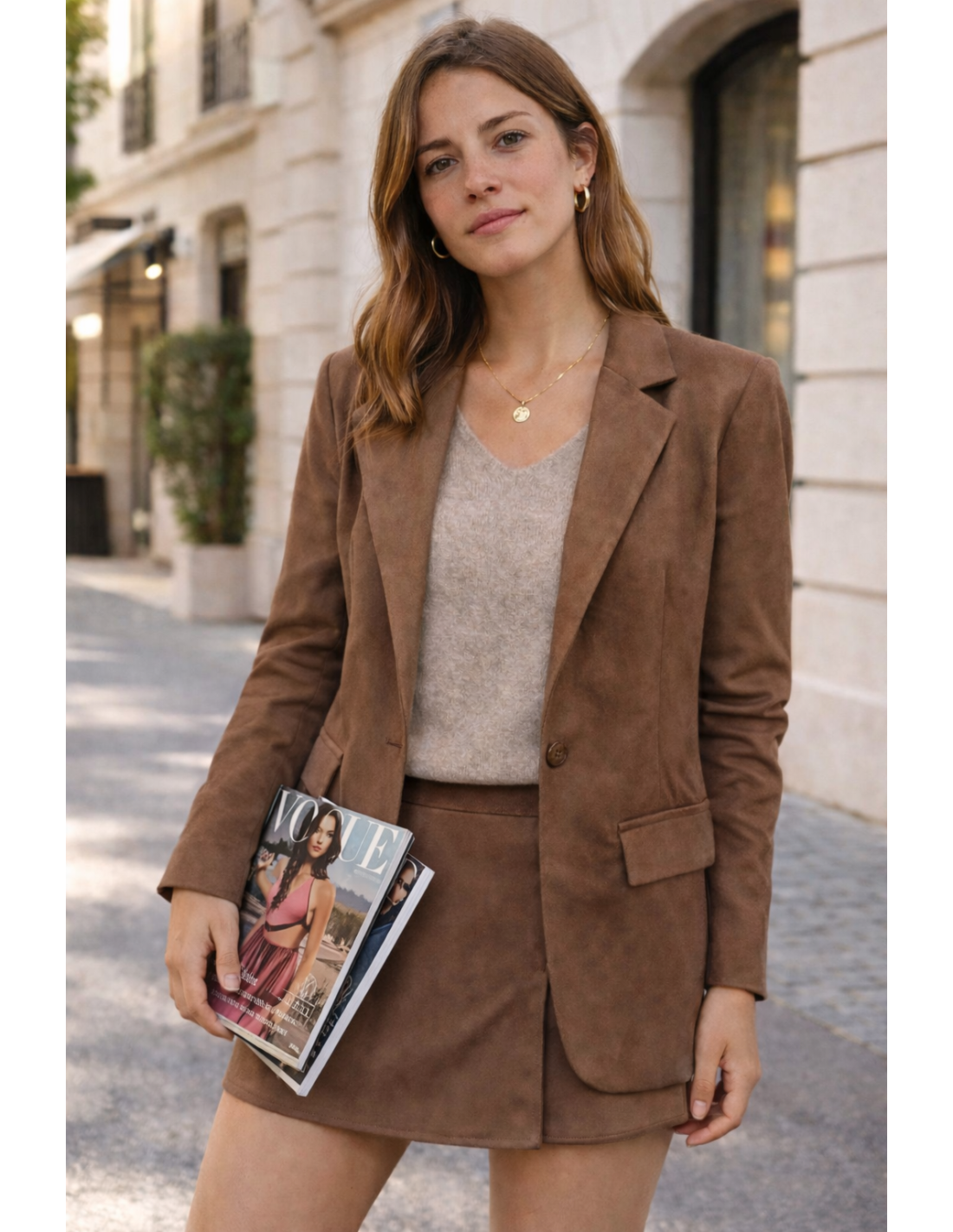 Blazer confeccionada en tejido tipo antelina de tacto suave y elegante, ideal para completar tus looks de oficina o estilo casual chic. Corte estructurado con solapa, perfecta para llevar con pantalones de vestir, jeans o faldas. Disponible en tallas SM (S–M) y LXL (L–XL).