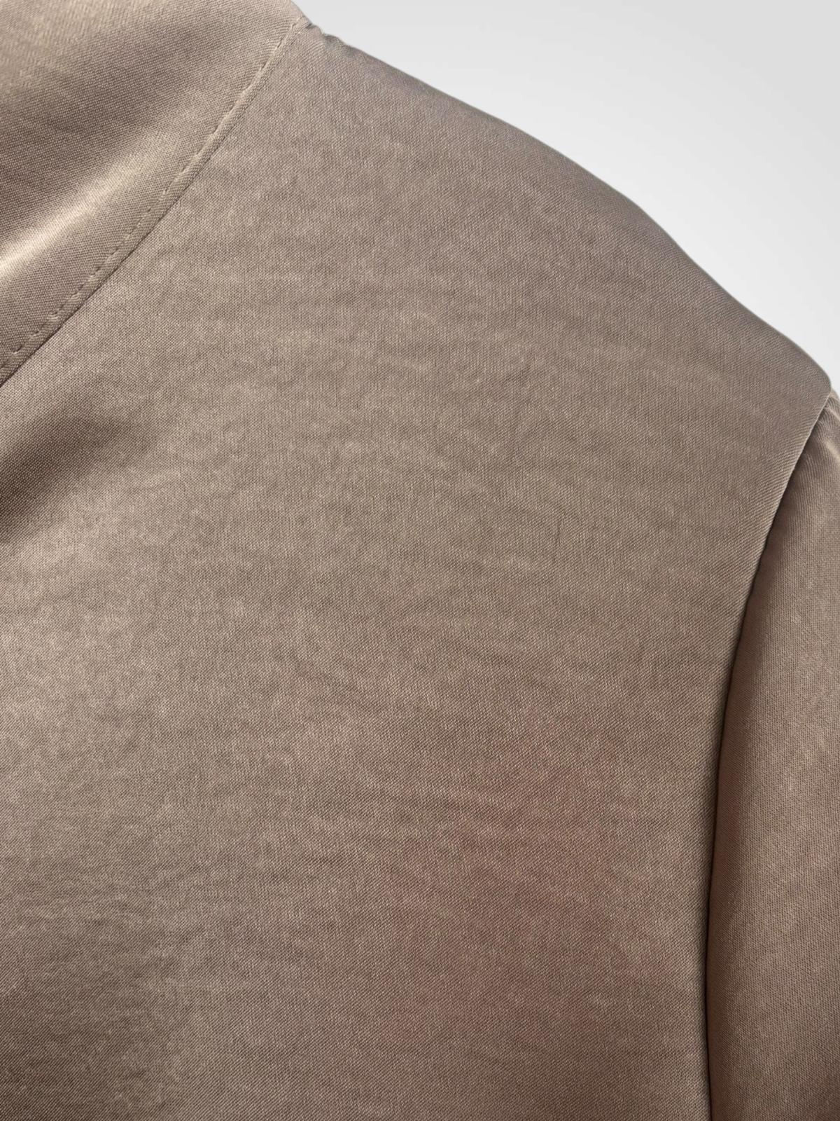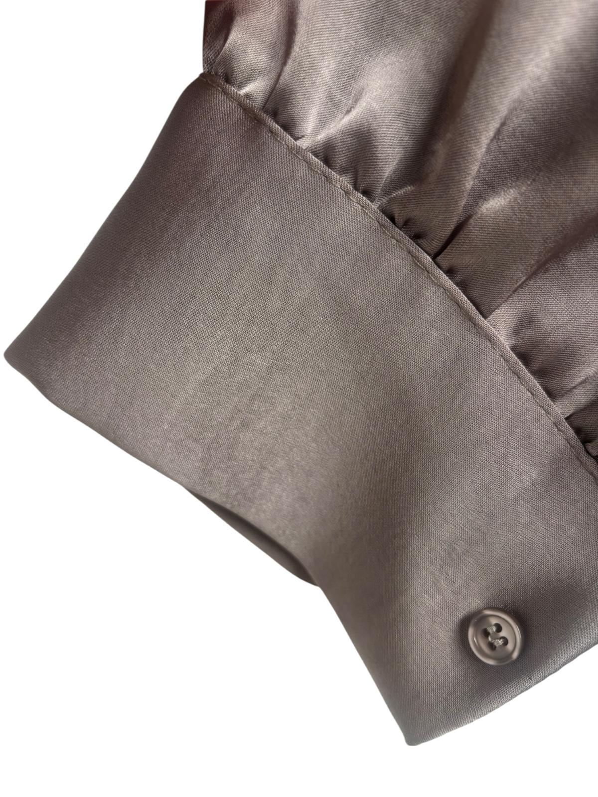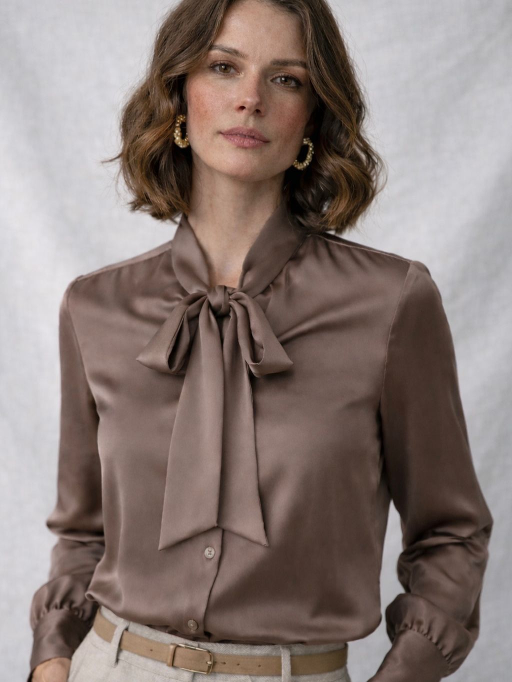 Camisa de satén con acabado suave y elegante, diseñada con un lazo frontal que aporta un toque sofisticado a tus looks. Ideal para combinar con pantalones de vestir, faldas o jeans para un estilismo elegante y femenino.