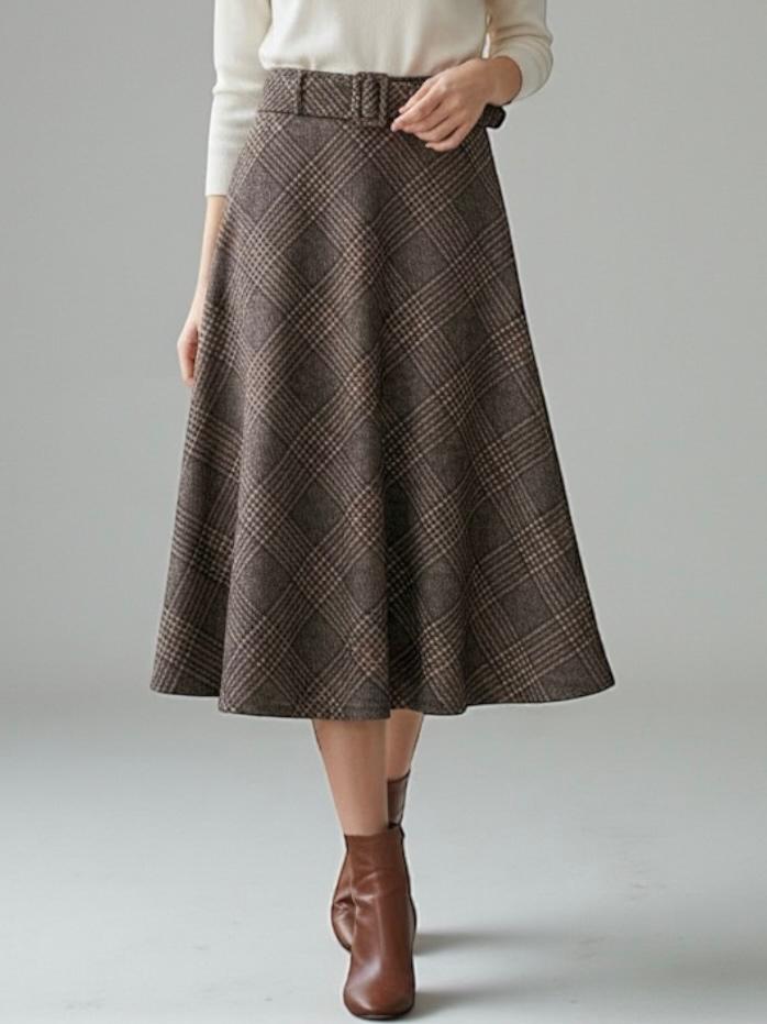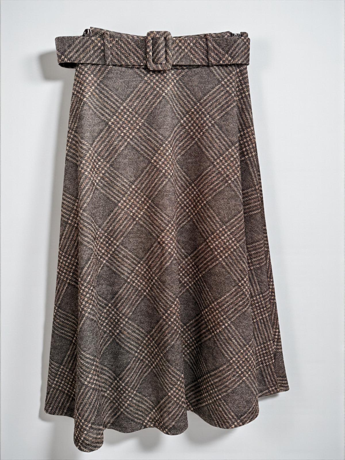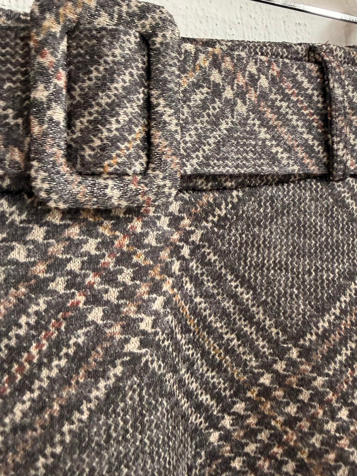 Falda midi de estilo clásico con estampado pata de gallo, una pieza versátil que aporta personalidad a cualquier look. Su línea recta con ligero vuelo ofrece un equilibrio perfecto entre elegancia y comodidad. Ideal para combinar con camisetas básicas, camisas oversize o jerséis finos.