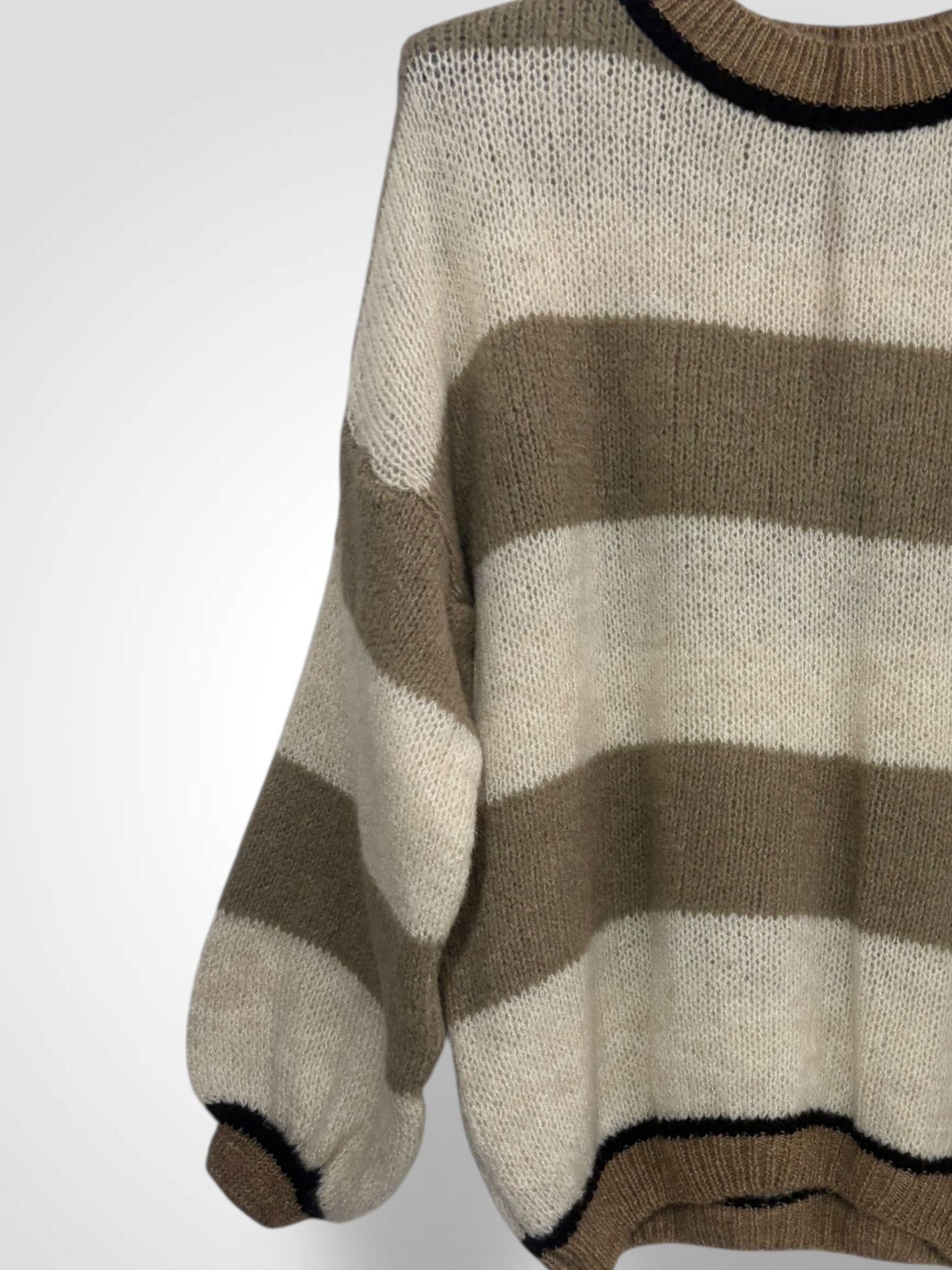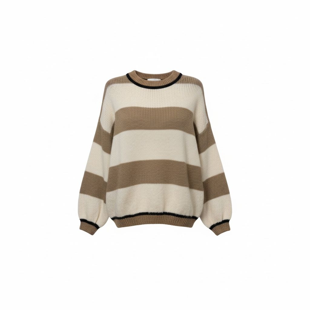 Jersey de punto suave con diseño de rayas clásicas y cuello redondo. Corte cómodo y ligeramente oversize que se adapta perfectamente a tallas desde la 36 hasta la 42. Ideal para combinar con jeans, pantalones de sastrería o faldas para crear looks de temporada.